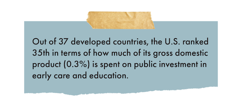 The United States puts far less public investment into early child care and education than other developed countries, and as a result, access to it is spotty and costly. The child care industry’s profit margins are such that it pays low wages, leaving many child care workers — 92% of whom are women, around half of whom are mothers of children under 18, and 40% of whom are women of color — struggling to afford child care themselves. Then there is the fact that the school day is shorter than most workdays, leaving parents (often mothers) struggling to fill in the gaps.