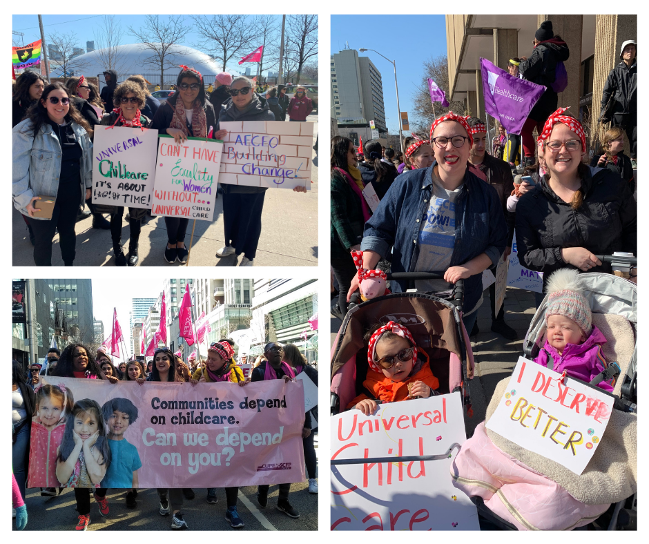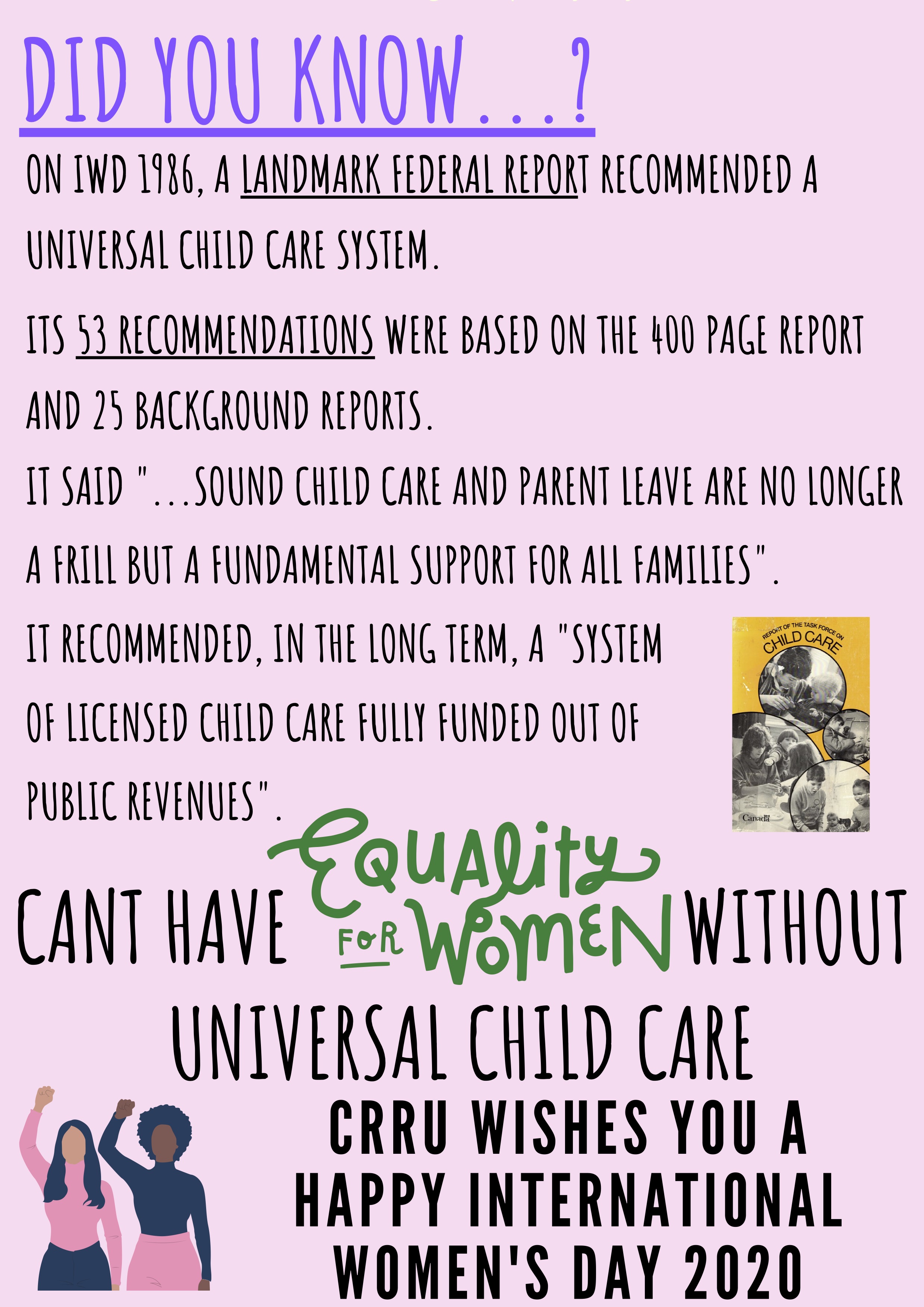 In 2021, feminists and child care advocates continue to advocate for universal child care as a key tenet of women’s equality, as they participate in International Women’s Day marches across the country, continuing to highlight the unfinished business of women’s equality and universal child care.